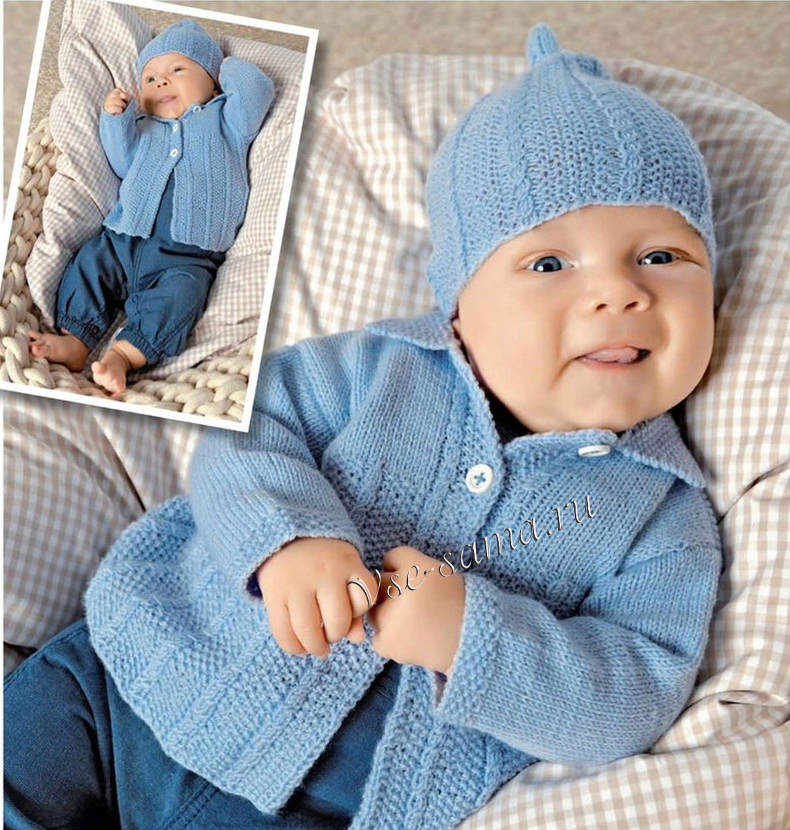 Голубое пальто, штанишки и шапочка - Пальто, курточки, пончо для малышей спицами