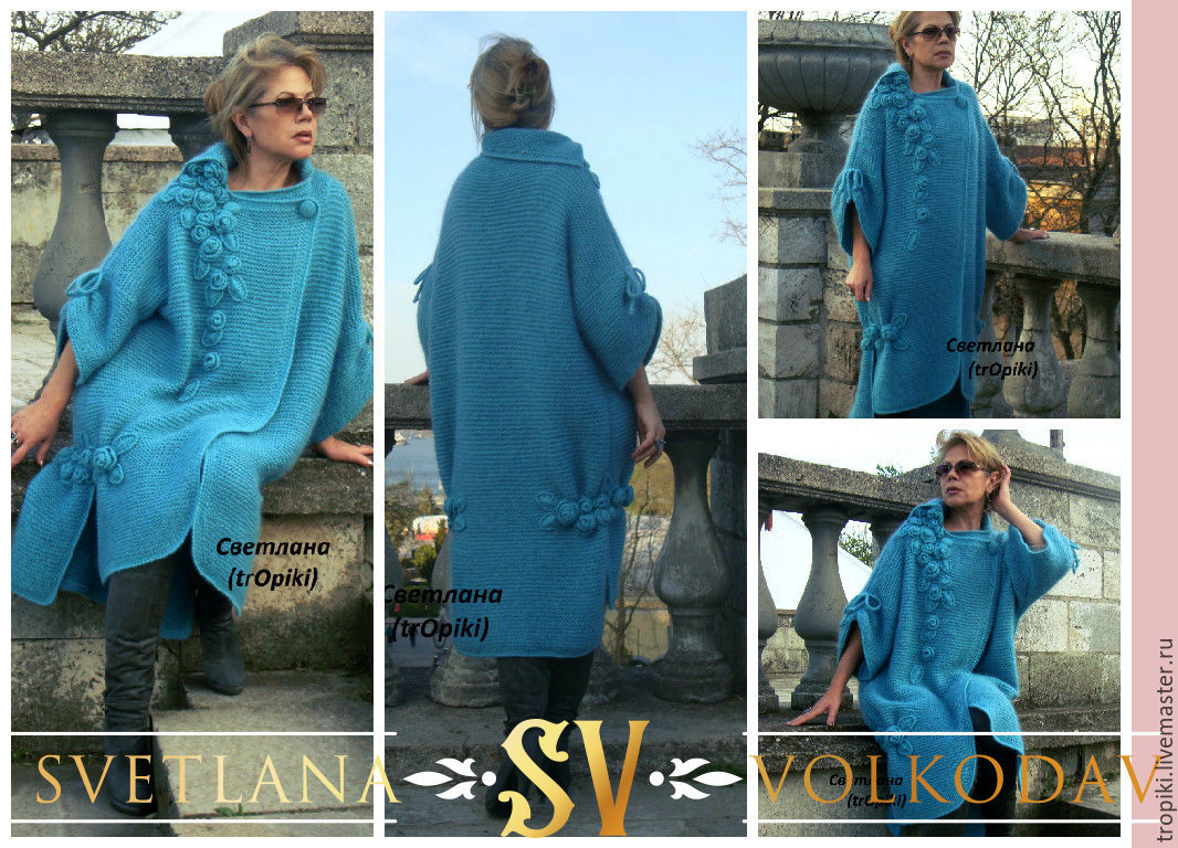 Купить "Водопад из роз"авторское вязаное пальто - голубой, пальто женское, пальто вязаное, лазурный