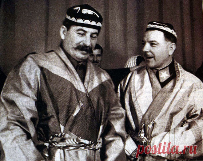 Иосиф Сталин и Климент Ворошилов в национальных костюмах, подаренных им делегатами - участниками совещания передовых колхозников Туркмении и Таджикистана. | Исторический дискуссионный клуб