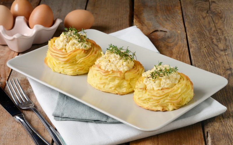 Отличный рецепт с двумя основными компонентами. Вкусная красивая закуски из картофеля, сыра и яиц в оригинальной подаче. Картофельные «гнезда» отлично подойдут и на завтрак.