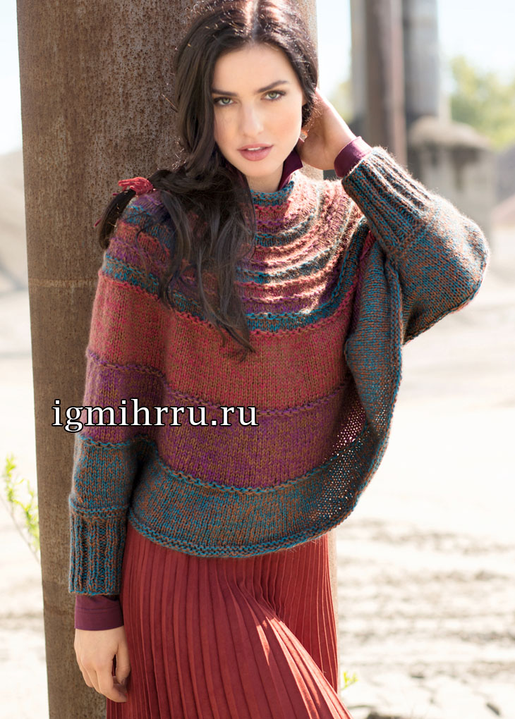 Шерстяное полосатое пончо с красивыми цветовыми переходами. Вязание спицами