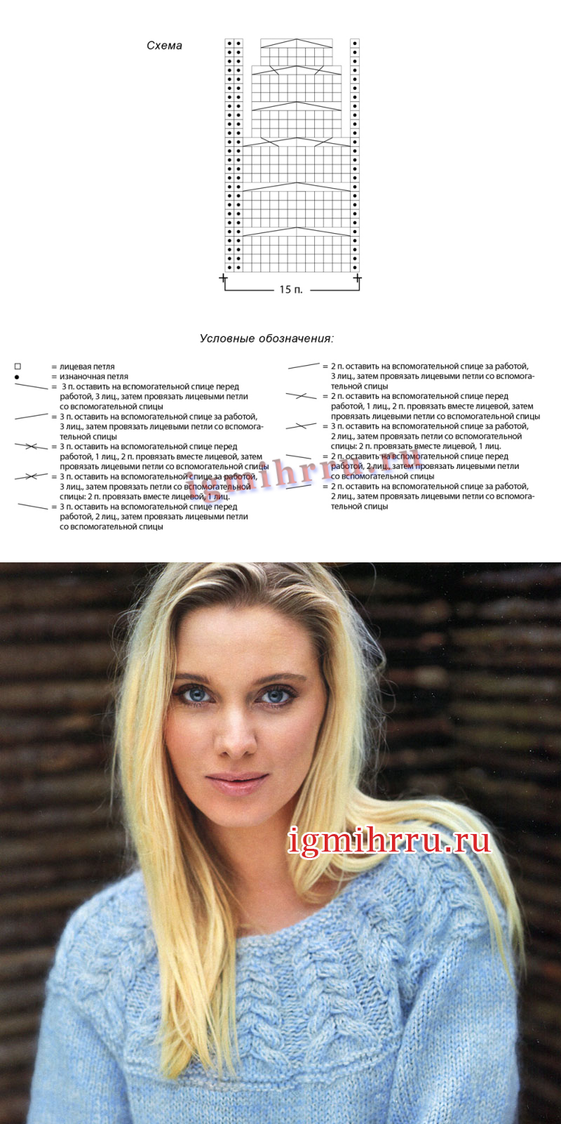 Голубой пушистый пуловер с кокеткой из «кос». Вязание спицами