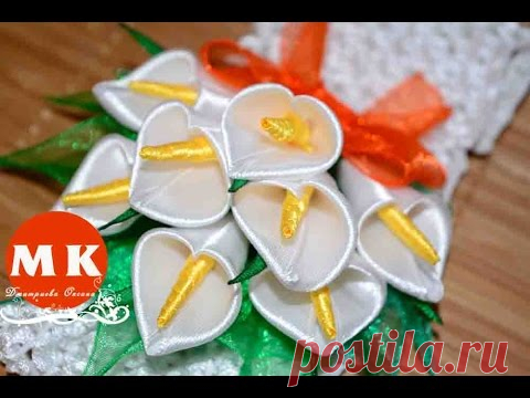 Канзаши мастер-класс.Цветы из лент.Повязка на голову.Каллы Канзаши/Flowers Kanzashi on the dressing