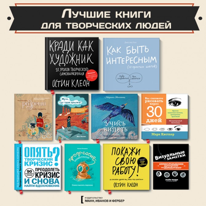 Лучшие книги для творческих людей Творчество — это не исключительный дар. Это то, что объединяет всех людей. Способность испытывать радость от самых обыкновенных вещей, например от того, что ты дышишь или пьешь чай, увидел возлюбленного или обнимаешь дерево. Вся наша жизнь — это по сути акт творчества. Делимся списком лучших книг, которые помогут раскрыть ваши творческие способности — P.S.: До 16 октября все книги по творчеству ( и саморазвитию ( — со скидкой 20% на бумажные и 35% на…