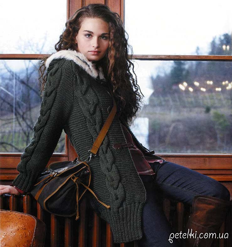 Кардиган с капюшоном косами, вязанный спицами. Описание, схемы, выкройка