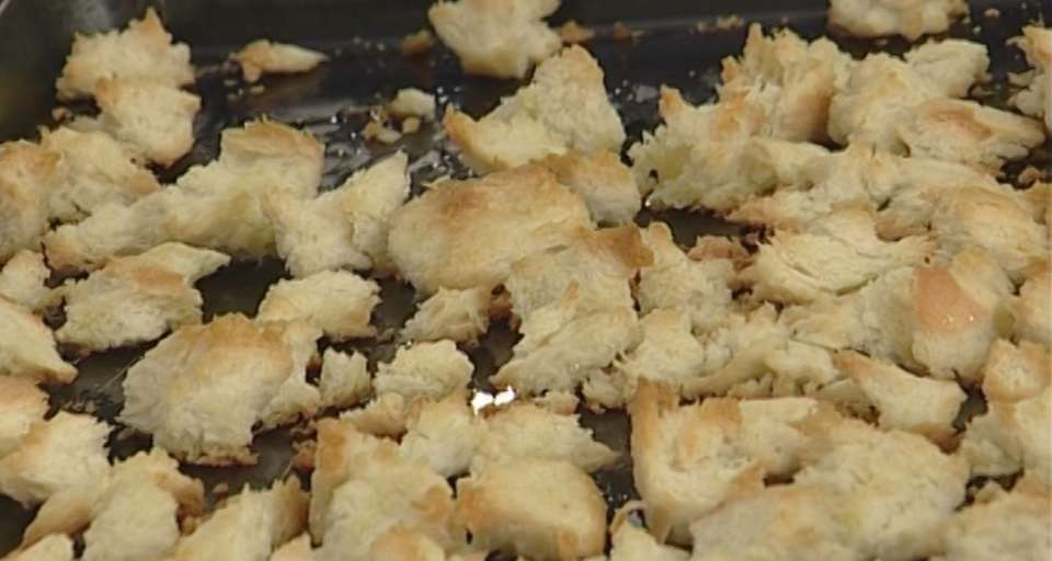 - На весь экран # шаг 1/8Приготовить крутоны: срезать с хлеба корку, поломать его на небольшие кусочки, сбрызнуть оливковым маслом и запекать в духовке 7–8 минут.