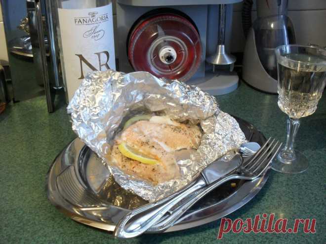 Рецепт: Семгу помыла почистила от чешуи и разделила стейк пополам, разрезала вдоль не прорезая кожу, сбрызнула соком лимона, посолила солью с травами и поперчила положила кусочки лимона. Из фольги сделала прямоугольники положила рыбку и свернула пополам фольгу завернув края как у вареника (можно сделать круг из фольги), оставив небольшое отверстие. налила немного белого сухого вина или шампанского закрыла полностью фольгу. Уложила конвертики в сотейник и закрыла крышку. на медленном огне довела