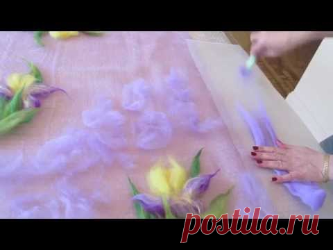 Валяние палантина с ирисами. Цветы из шерсти на шелке. Making wool flowers - tippet felting.