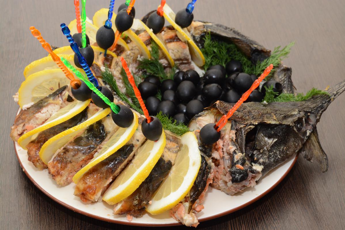Осетр по-царски, запеченный, фаршированный форелью рецепт с фото
