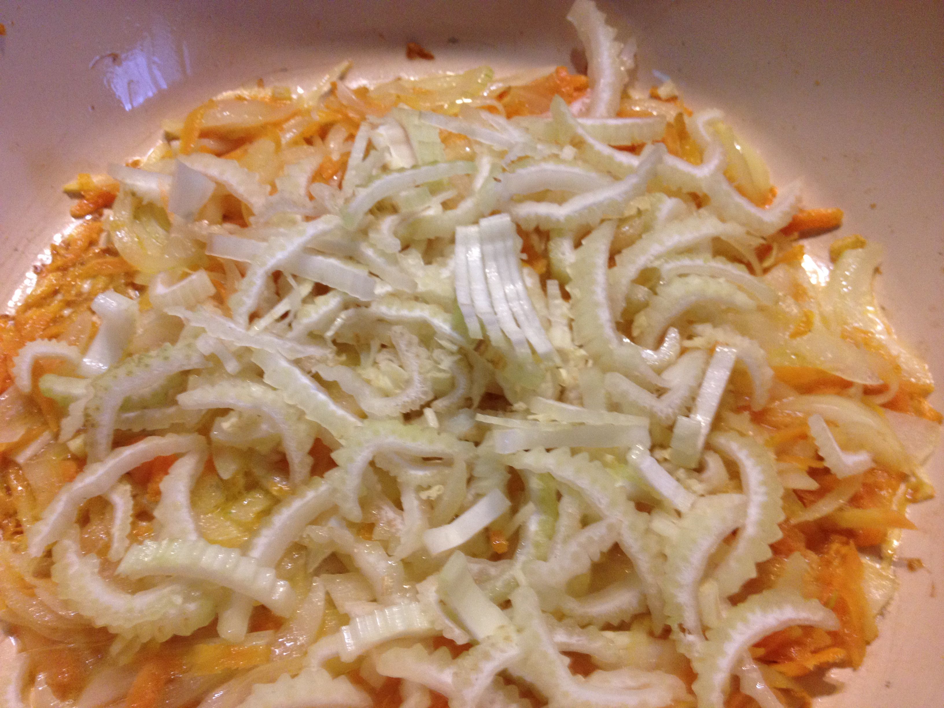 обжарить на растительном масле до полуготовности. Сельдерей добавить в последним.