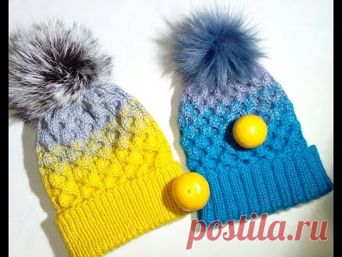 Шапка с узором соты.Шапка с градиентом.Шапка спицами и меховым помпоном. Мастер класс.