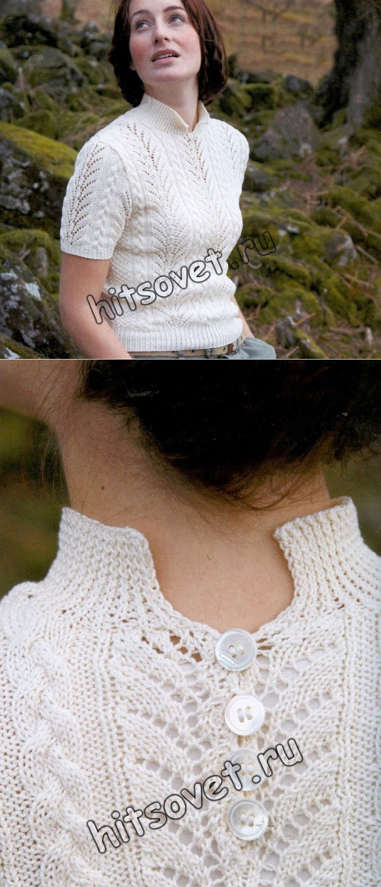 Белый джемпер с ажурными и рельефными узорами (спицы)