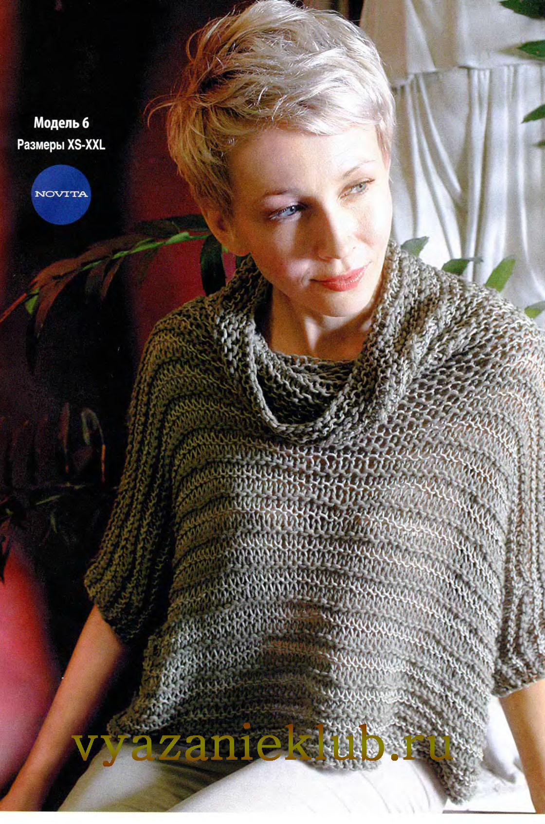 Укороченный пуловер с цельновязанными воротником и короткими рукавами. Спицами. Размеры: XS, S, M, L, XL, XXL. / vyazanieklub.ru
