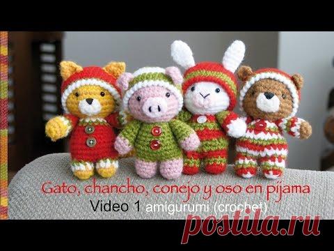 Oso, gato, chancho y conejo bebés en pijamas (crochet-amigurumi) Parte 1