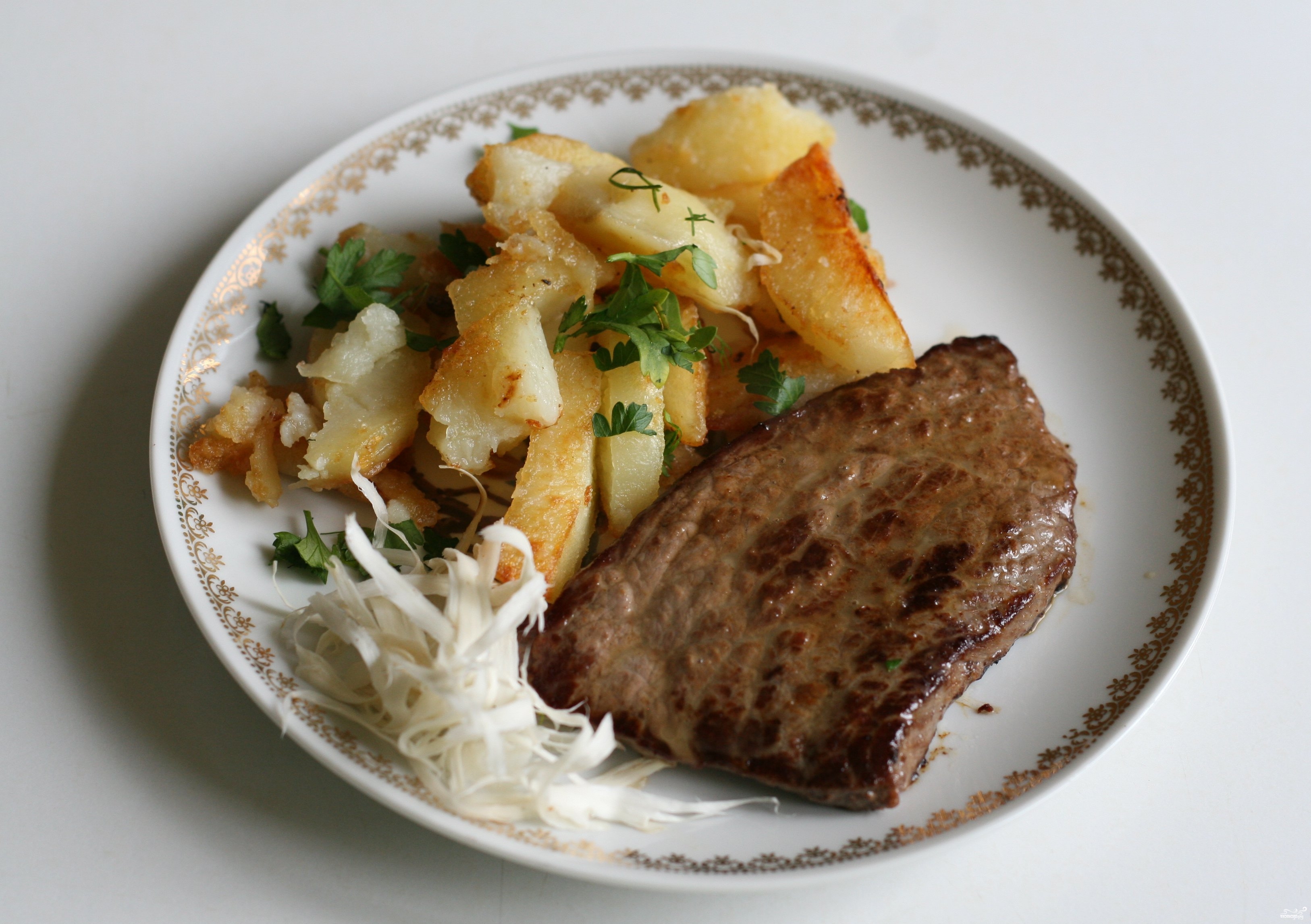 - 1 Из говяжьей вырезки можно приготовить много различных блюд. В нашей семье очень любят лангет с гарниром. Для приготовления лангета традиционно берется говядина. 2 Мясо нарезается на части толщиной не более 1 сантиметра. 3 Затем мясо отбивается кулинарным молотком с обеих сторон. По форме оно должно напоминать бифштекс. Солим и приправляем по вкусу и отправляем на сковороду. 4 Обжариваем лангеты с обеих сторон до готовности. Мясо обваливать ни в муке, ни в сухарях не нужно. 5 Натираем хрен, будем его подавать вместе с мясом. За время, пока жарится говядина, можно приготовить любой гарнир. Я решила подать лангет с жареным картофелем (это может быть и фри), который у меня остался после обеда. 6 Подаем лангет с гарниром в горячем виде. Приятного аппетита!