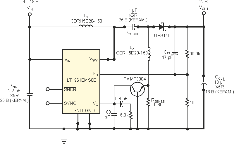 Один транзистор защищает преобразователь от коротких замыканий. Предлагаемая схема на одном транзисторе, опуская уровень напряжения на выводе VC (выход усилителя ошибки) при резком увеличении тока дросселя, происходящем при перегрузке или коротком замыкании выхода, обеспечивает надежную защиту SEPIC от коротких замыканий