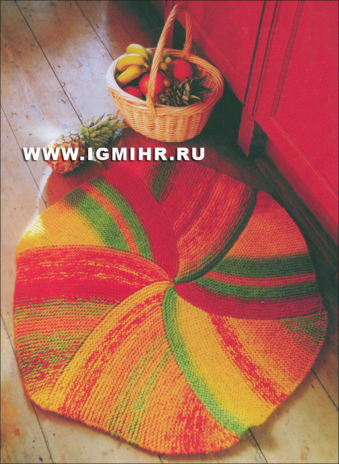 Яркий круглый коврик для украшения домашнего интерьера. Спицы