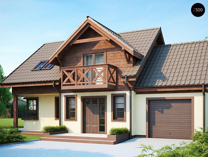 Проект дома с гаражом, с красивым мансардным окном и боковой террасой - Z33