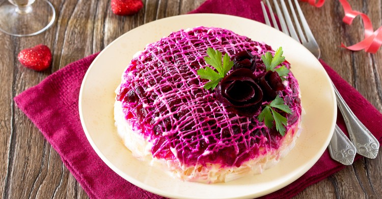 =Филе селедки - 300 г Картофель - 300 г Морковь - 300 г Свекла - 300 г Яблоки - 300 г Лук репчатый - 150 г Майонез - по вкусу