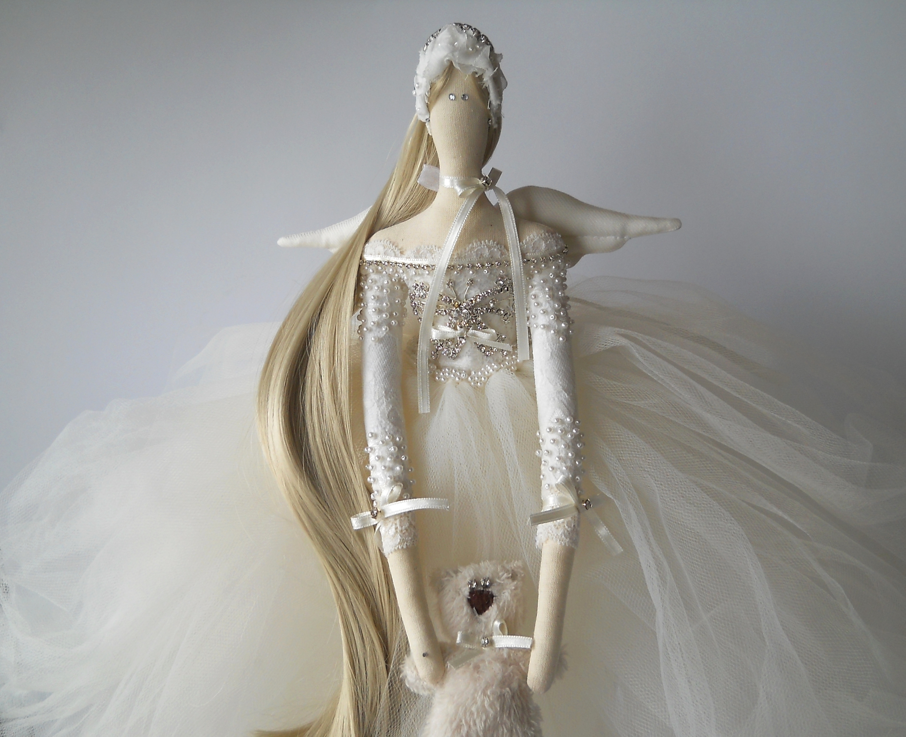 OOAK balerina angel Tilda is 25 inches (65 cm) tall lady. She is made of cotton, linen, lace, pearls and tulle. She wearing tulle- lace dress . The hair is made of artificial hair. This charming doll can decorate your home or be an excellent gift. Each doll is unique OOAK creation. It is filled with hypo-allergenic polyester fiberfill (like pearl).