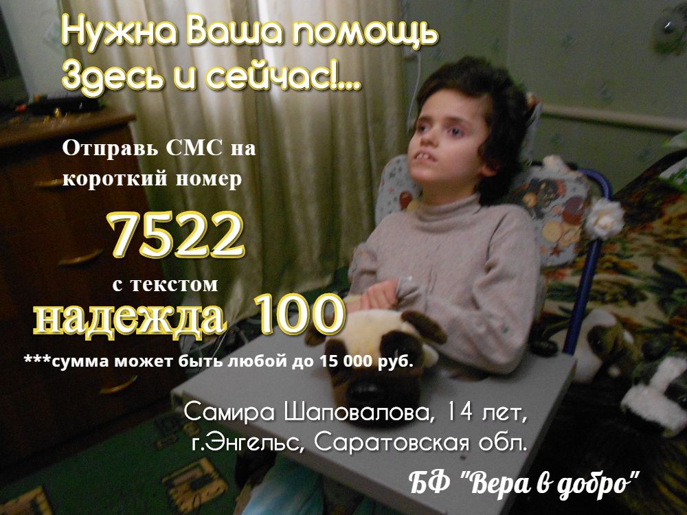 Самира Шаповалова, 03.05.2002 г.р., с.Ленинское, Саратовская обл. Энгельсский р-н Диагноз:Дисгенезия головного мозга, спастический тетрапарез, псевдобульбарный паралич, глубокая умственная отсталость, симптоматическая эпилепсия, фокальные и вторично генерализованные приступы. Фоновая ангеопатия сетчатки, аномалияжелчного пузыря, вторичный диспластический левосторонний грудно-поясничный сколиоз 3 ст., правосторонний подвывих тазобедренного сустава.