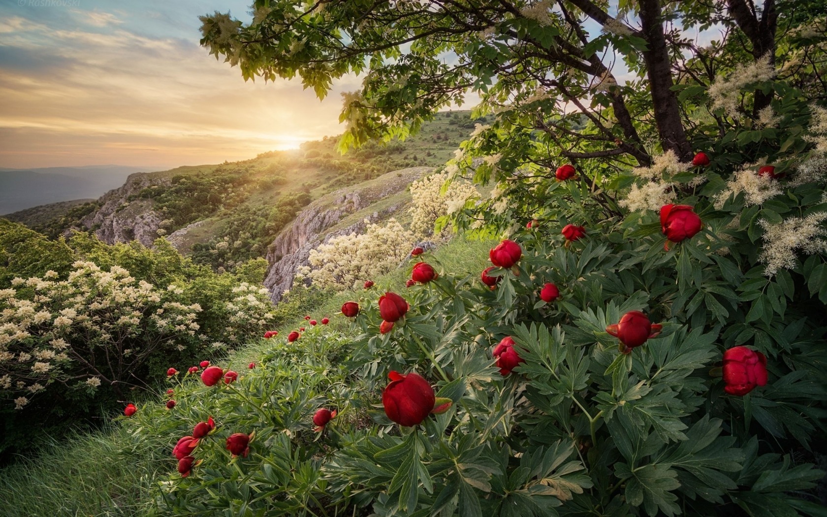 Скачать обои Закат, Цветы, Горы, раздел пейзажи в разрешении 2560x1600