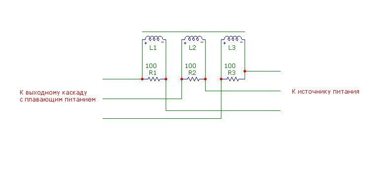 Персональный сайт - Наш ответ Чемберлену. Если суть не понятна, то поясним, что дроссель наматывается в три провода на ферритовом кольце. Резисторы используются для снижения добротности индуктивности и исключения паразитных резонансов при участии емкости монтажа, проводов к акустике и т.п. Сумма токов питания в обмотках всегда равна нулю (с учетом направления токов) и подмагничивания сердечника не происходит. А вот выходное напряжение усилителя будет именно синфазным и будет задержано на высо