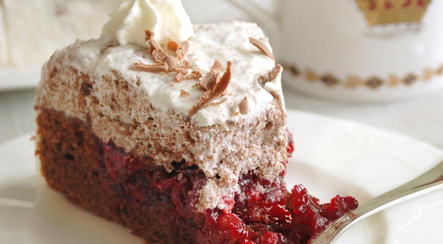 - Получившееся углубление в корже, а также край самого коржа пропитайте оставшимся ликером или коньяком (2 ст. ложки – около 20 мл) с помощью ложки или кисточки. Выложите в углубление коржа всю остывшую вишневую начинку.