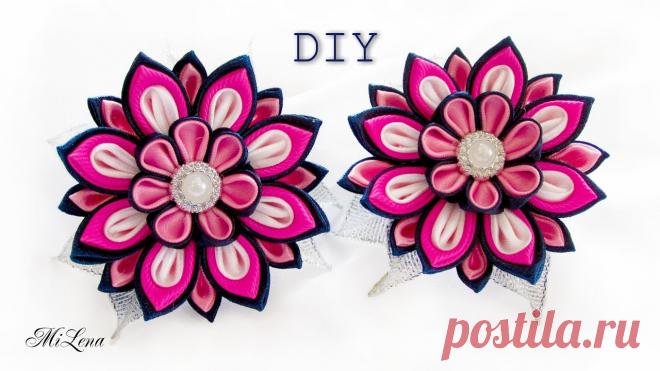 Резинки канзаши, МК / Простые канзаши / DIY Scrunchy with Kanzashi flower Для пары резинок понадобится: Лента атласная ширина 5 см -темно-синяя- 80 см Лента атласная ширина 4 см - розовая (репс) - 70 см - белая – 70 см Лента атласн...