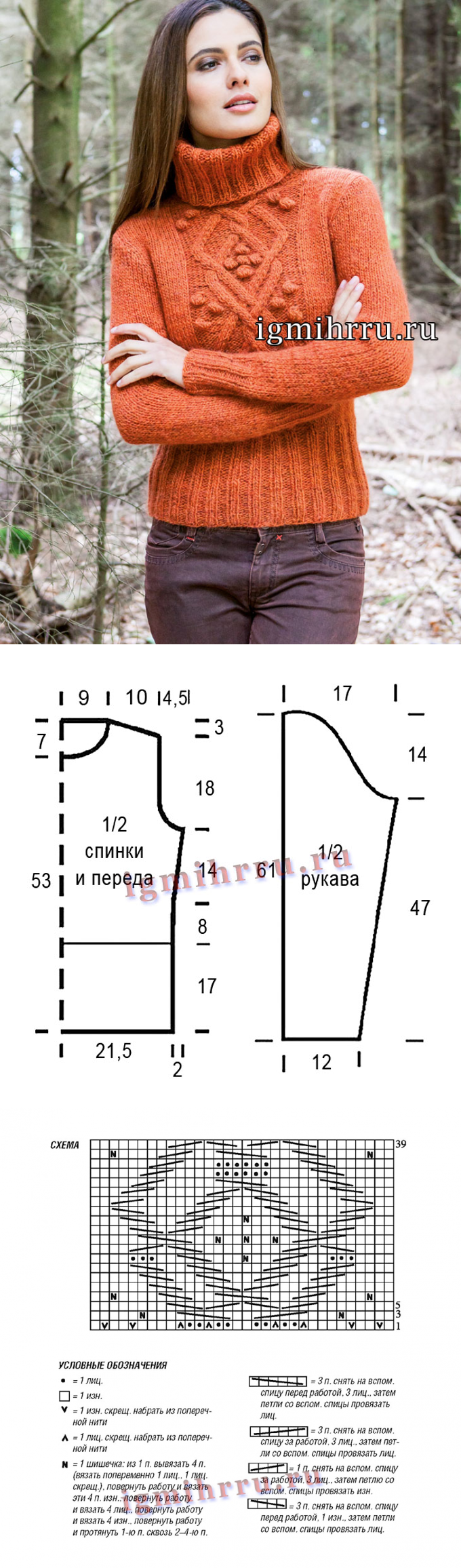Оранжевый свитер с узором из ромбов и «шишечек». Вязание спицами