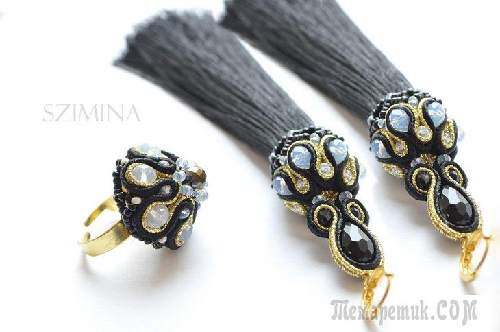 Сутажные серьги-кисти «Оскары» Для изготовления серег нам потребуются следующие материалы:1. Бусины рондели 6*4 мм — 12 шт.2. Бусины рондели 2*3 мм — нить.3. Бусины капли 12*7 мм — 2 шт.4. Рондели черного цвета 3*4 мм — 4 шт.5. Бис...