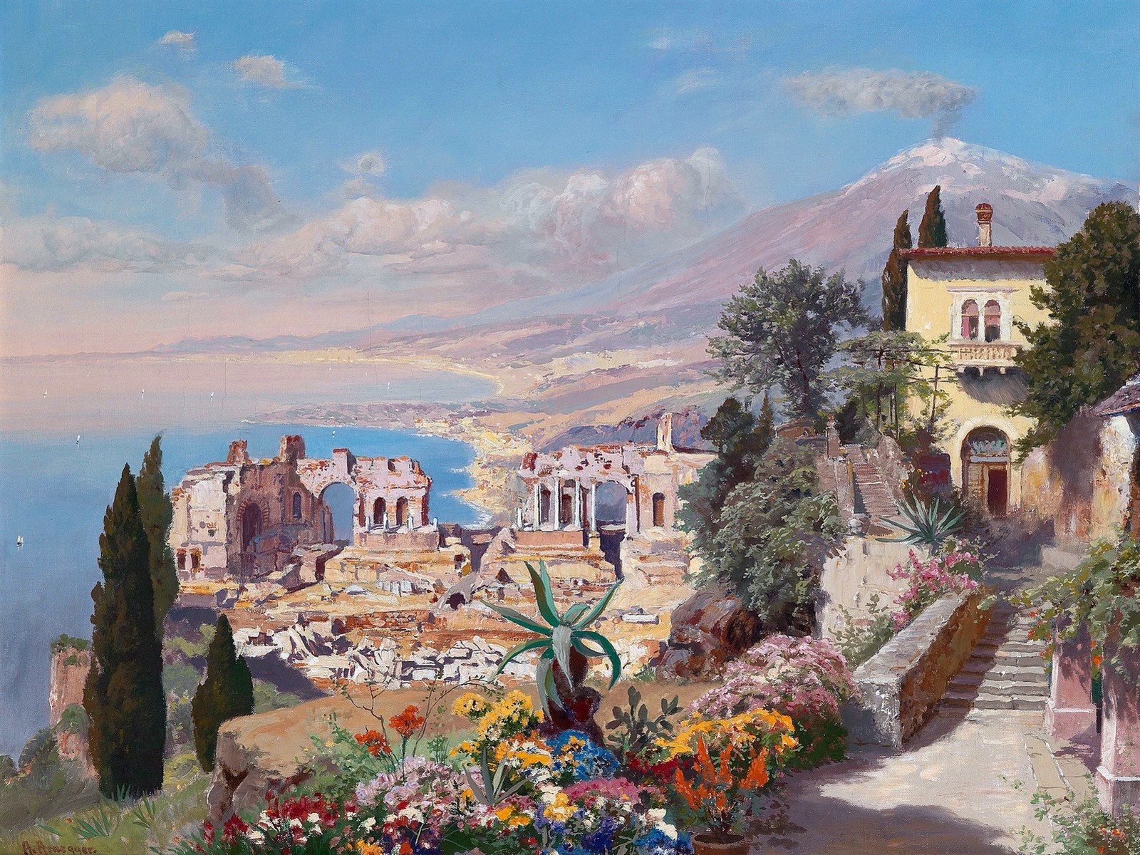 Скачать обои Пейзаж Alois Arnegger, вид на город Таормина, Сицилия на рабочий стол 1600x1200