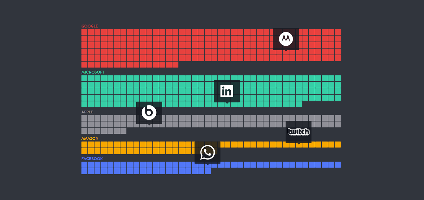 We visualized acquisitions by the Big Five tech companies since 1985, here’s what we learned | Geckoboard We visualized the data behind all of the mergers and acquisitions by the Big Five tech companies from 1985 to today. See who Google, Amazon, Apple, Facebook and Microsoft have snatched up and how m...