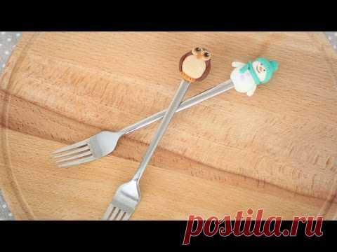 Снеговик и сова из полимерной глины. Декор десертной вилки, ложки