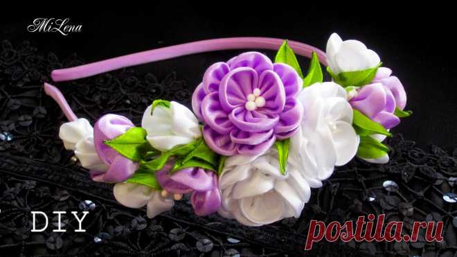 ОБОДОК КАНЗАШИ, МК / DIY Kanzashi Headband Для ободка с цветами потребуется: - лента атласная белая (ширина 4 см) - 2 м - лента атласная лиловая (ширина 4 см) - 1,5 м - лента атласная салатовая (ширин...