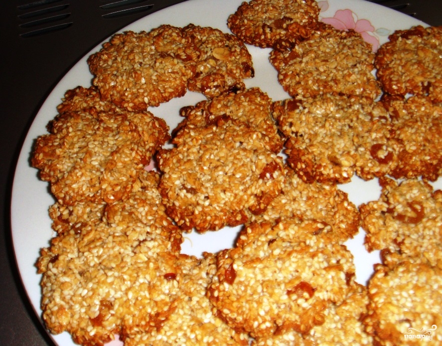 - Положите сырой кунжут в сито и хорошенько промойте под струей прохладной воды. Переложите кунжут в миску. Вымойте изюм и отправьте к кунжуту. Лучше брать изюм светлых сортов. Добавьте к ингредиентам жидкий мед. Грецкие орешки перемолите на кофемолке или блендере. Также ореховую крошку можно получить при помощи мясорубки, пропустив несколько раз через нее орешки. Добавьте ореховую крошку к остальным ингредиентам, туда же всыпьте овсяные хлопья. Застелите противень пергаментом для запекания. Намочите руки и сформируйте шарики небольшого размера из получившейся массы. Затем выложите шарики на пергамент и приплюсните их. Выпекайте печенье в духовке при температуре сто восемьдесят градусов. На выпекание уйдет всего двенадцать минут. Блюдо может легко пригореть, поэтому внимательно за ним следите.