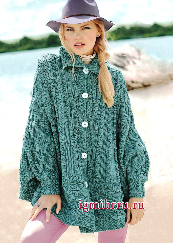 Микс выразительных узоров. Голубовато-зеленая накидка из мериносовой шерсти. Вязание спицами