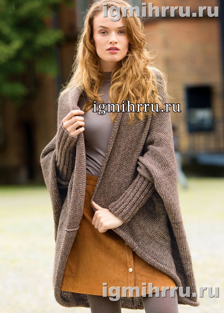 Просторный коричневый жакет с высокими планками рукавов. Вязание спицами