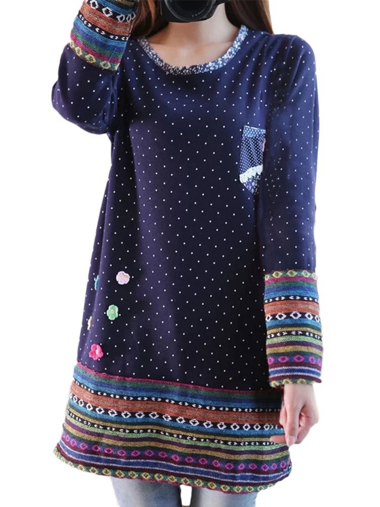 Ethnic Polka Dot Printed Stereo Flower Stitching Loose Fleece Dresses Online - NewChic