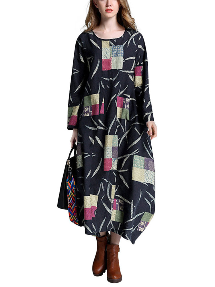 O-Newe Vintage Color Block Printed Long Sleeve Ball Gown Maxi Dress - Newchic Fashion Dress
