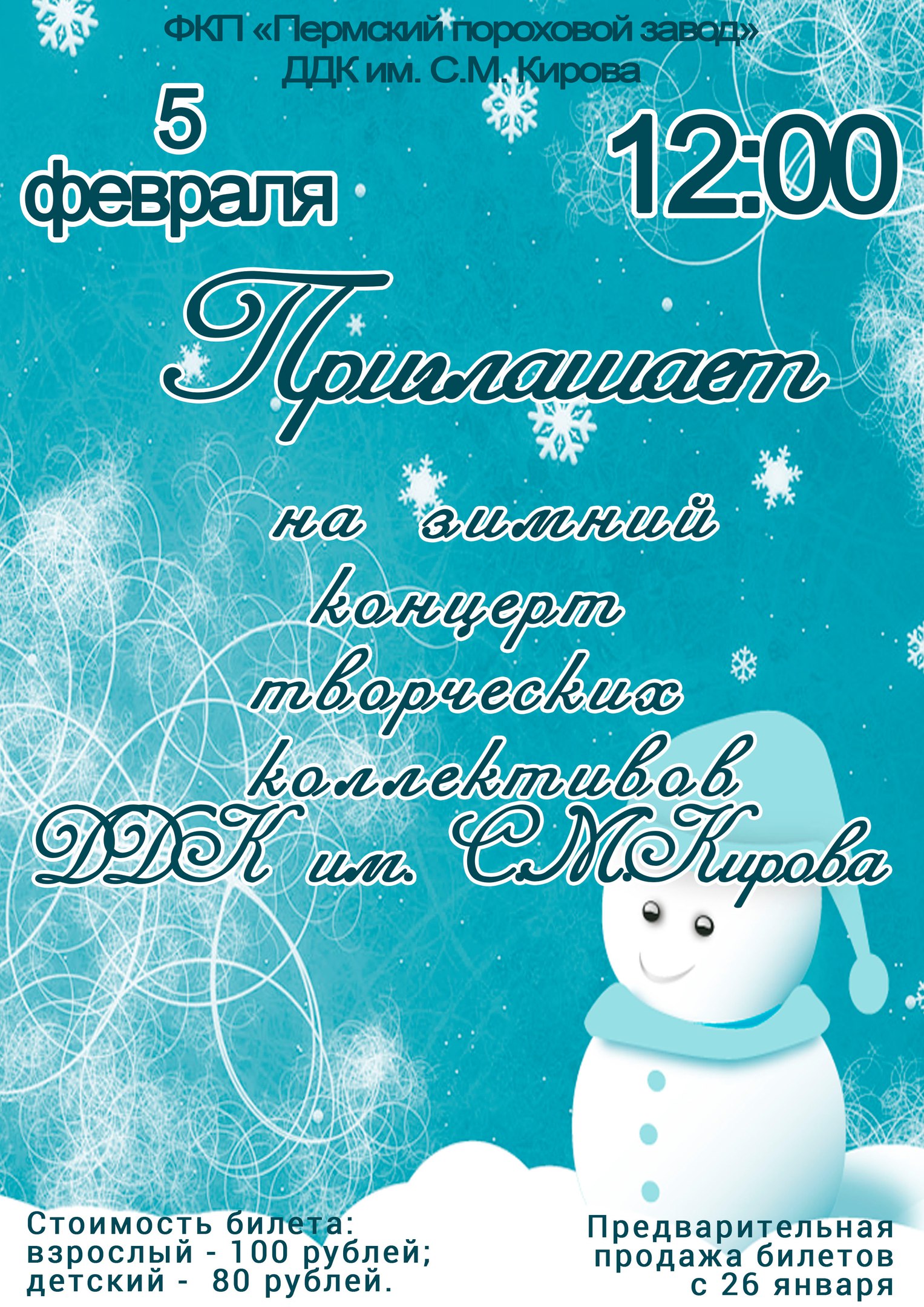 ФКП 'Пермский пороховой завод' ДДК им.С.М. Кирова приглашает всех на зимний концерт творческих коллективов.