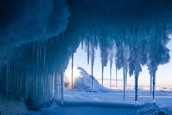 Ледяные гроты Байкала | Чёрт побери Январь. Всё, что можно, уже замёрзло, столбик термометра опускался до -40. Байкал встаёт, рвёт лёд, образуются торосы, где то парят открытые участки воды. Но до них далеко и ещё опасно. Пройдём по берегу. Местность за Туркой. В этом месте гора у посёлка загораживает солнце, берег освещается лишь пару часов в день. На Байкале тепло, перепад с городом — градусов 15. Волны сделали своё дело, слой ледяных наплесков у берега достигает метра, ...