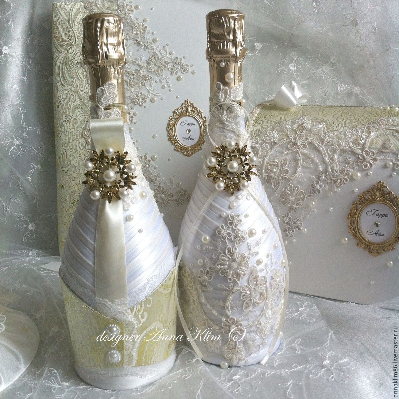 Костюмы на бутылки из коллекции 'Версаль' Купить или заказать Костюмы на бутылки из коллекции 'Версаль' в интернет-магазине на Ярмарке Мастеров. Стоимость указана только за декор! Бутылки заказчик покупает сам и привозит мастеру для дальнейшего декорирования! Возможны варианты цвета! Костюмы делаются непосредственно на бутылках! Основные элементы декоры: свадебное кружево, жилеточка из блестящей парчи, броши. Цветовая гама: айвори, беж, золото.