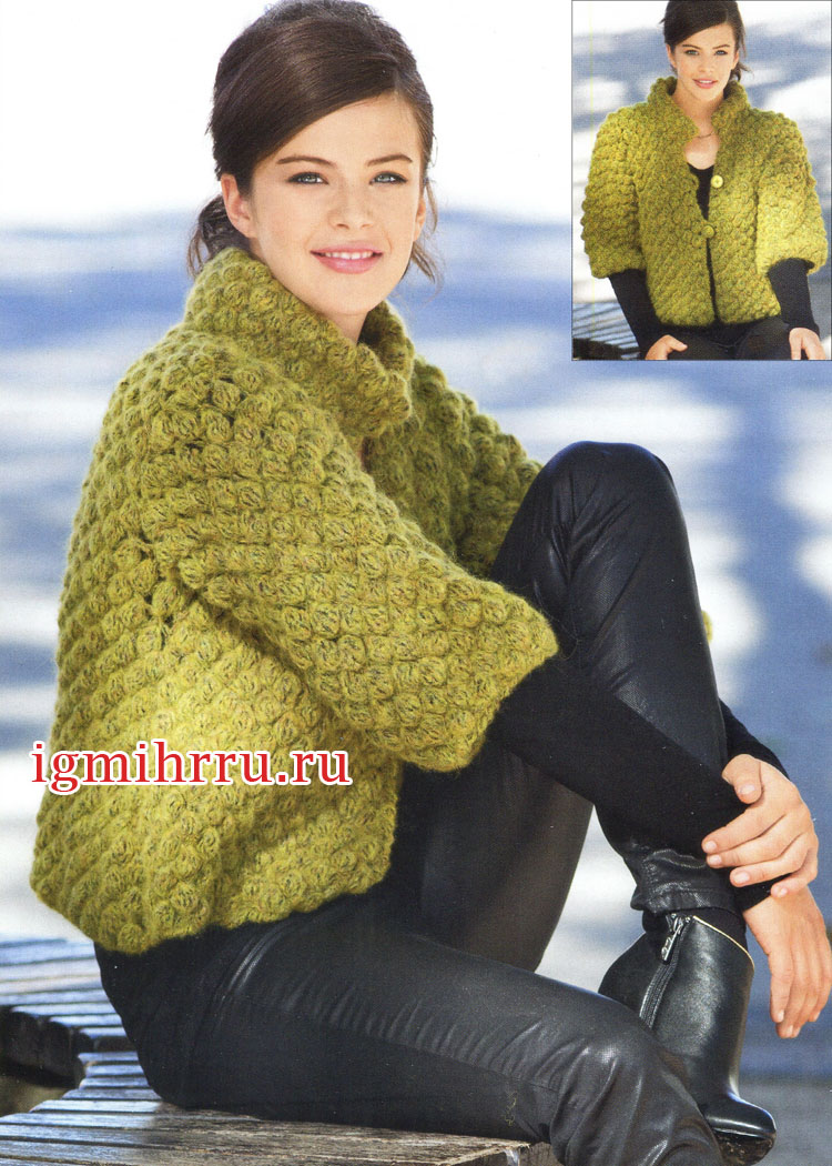 Объемный теплый жакет с узором из «шишечек». Вязание крючком