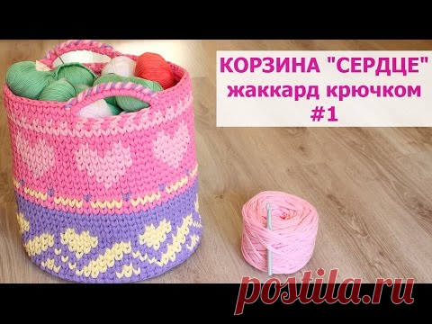 БОЛЬШАЯ КОРЗИНА "СЕРДЦЕ" ИЗ ТРИКОТАЖНОЙ ПРЯЖИ ЛЕНТА, СПАГЕТТИ. ЖАККАРД КРЮЧКОМ ПО КРУГУ. Часть 1