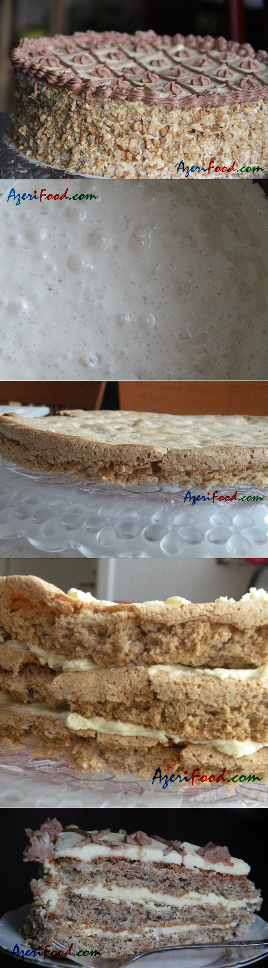 Торт Апшерон =Тесто: Яйца – 6 штук сахар – 400 грр сода – 1/3ч.л (гашеная укс.эссенцией) или 1,5 ч. ложки разрыхлителя ванилин – 1,5 ч.л мука – 200 гр. орехи – 200 гр. орехи на украшение – 100-150 гр =Крем: Сливочное масло – 250 гр. Сгущеное молоко – 2/3 банки Песок – 0,5 стакана Молоко – 0,5 стакана Mука – 1,5 ст.л. =Время выпечки: 25 минут Температура выпечки: 180 гр. Цельсия