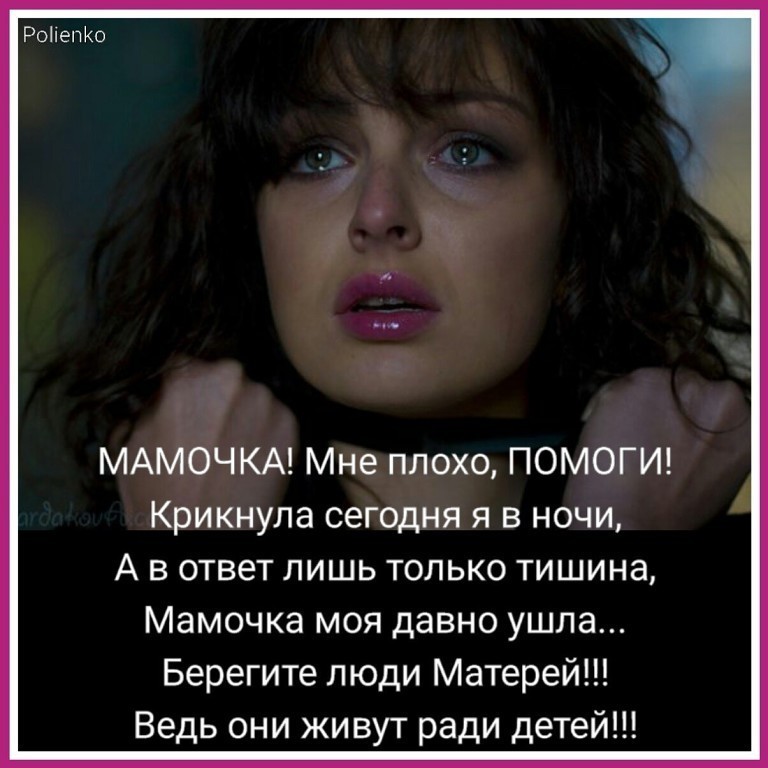 Вернуть бы маму на мгновенье... Сказать всё то, что не успела ей сказать. Обнять как прежде нежно - нежно, И гладить плечи, руки целовать… Мамулька, милая, родная, Осталось только память о тебе. Могильный холм, плита из камня. И боль, что бьёт, и время не спасло. Я по тебе скучаю очень сильно мама. Скучаю так, что трудно рассказать. Как я хочу, чтоб ты была бы рядом. Но нет пути, дороги нет назад.