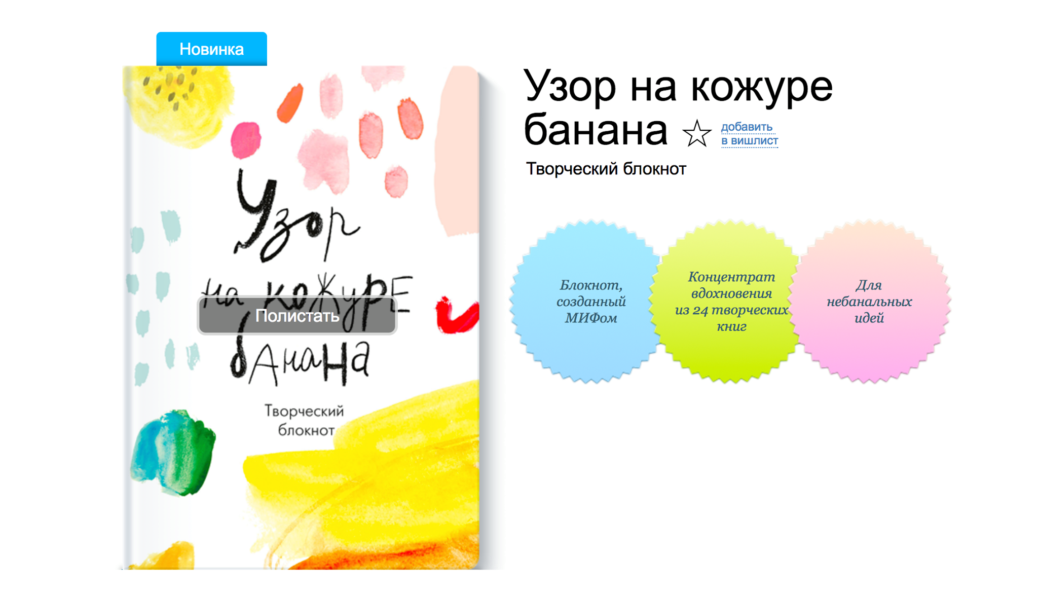 Если у вас никогда не было творческого блокнота, присмотритесь к новинке «Узор на кожуре банана». В нем можно писать, рисовать и фантазировать. В нем множество вдохновляющих и мотивирующих цитат. А еще в нем есть упражнения на развитие креативности и творческого начала. Рассказываем про интересные факты об этом блокноте —