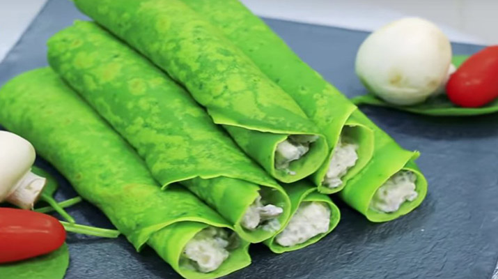Рецепт приготовления зеленых блинчиков, фаршированных грибами, Это необычайно вкусное и полезное блюдо. Кроме того, его яркий вид просто приводит в восторг!