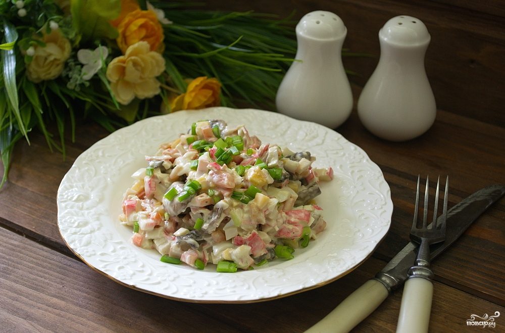 - Крабовые палочки мелко нарезать. Нарежьте кубиком сыр и отварные яйца. Отварную морковь нарезать кубиком. Грибы обжарить на растительном масле. Слегка посолить и поперчить. Дать остыть и добавить в салат. Заправьте салат сметаной. На мой вкус соль и прочие пряности не нужны. Тут богатый вкус продуктов и они имеют свою соль. Салат очень вкусный.